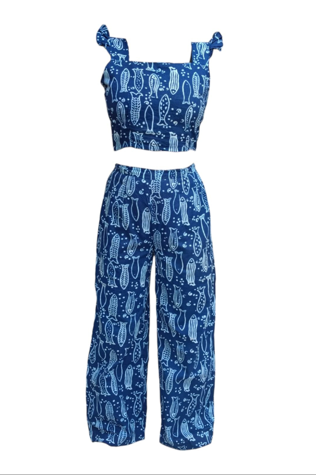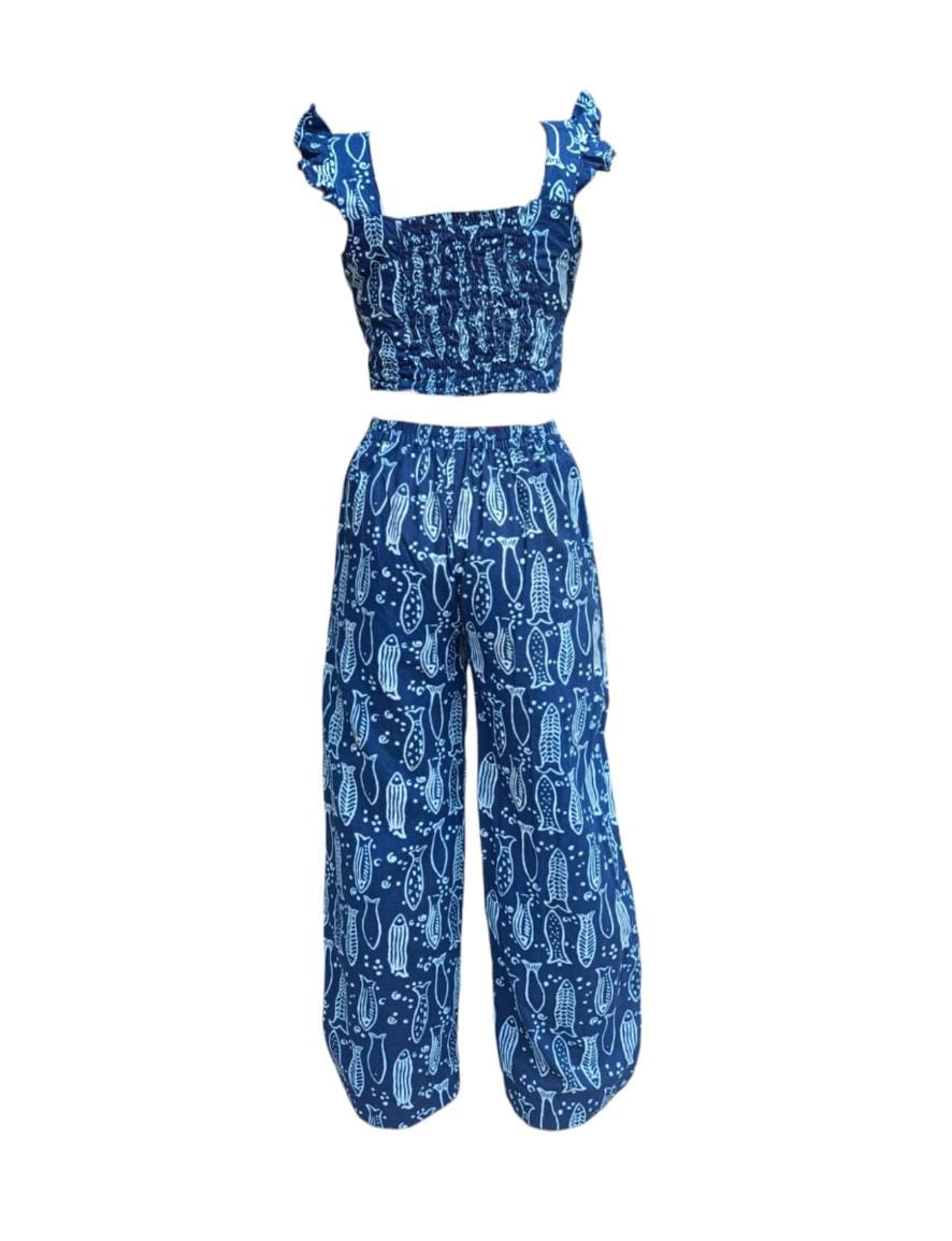 Introducing the Nami Co-ord set - perfect for summer! Made with pure cotton fabric, this set features a unique handblock print of fish patterns. A stylish and comfortable choice for warm weather.
